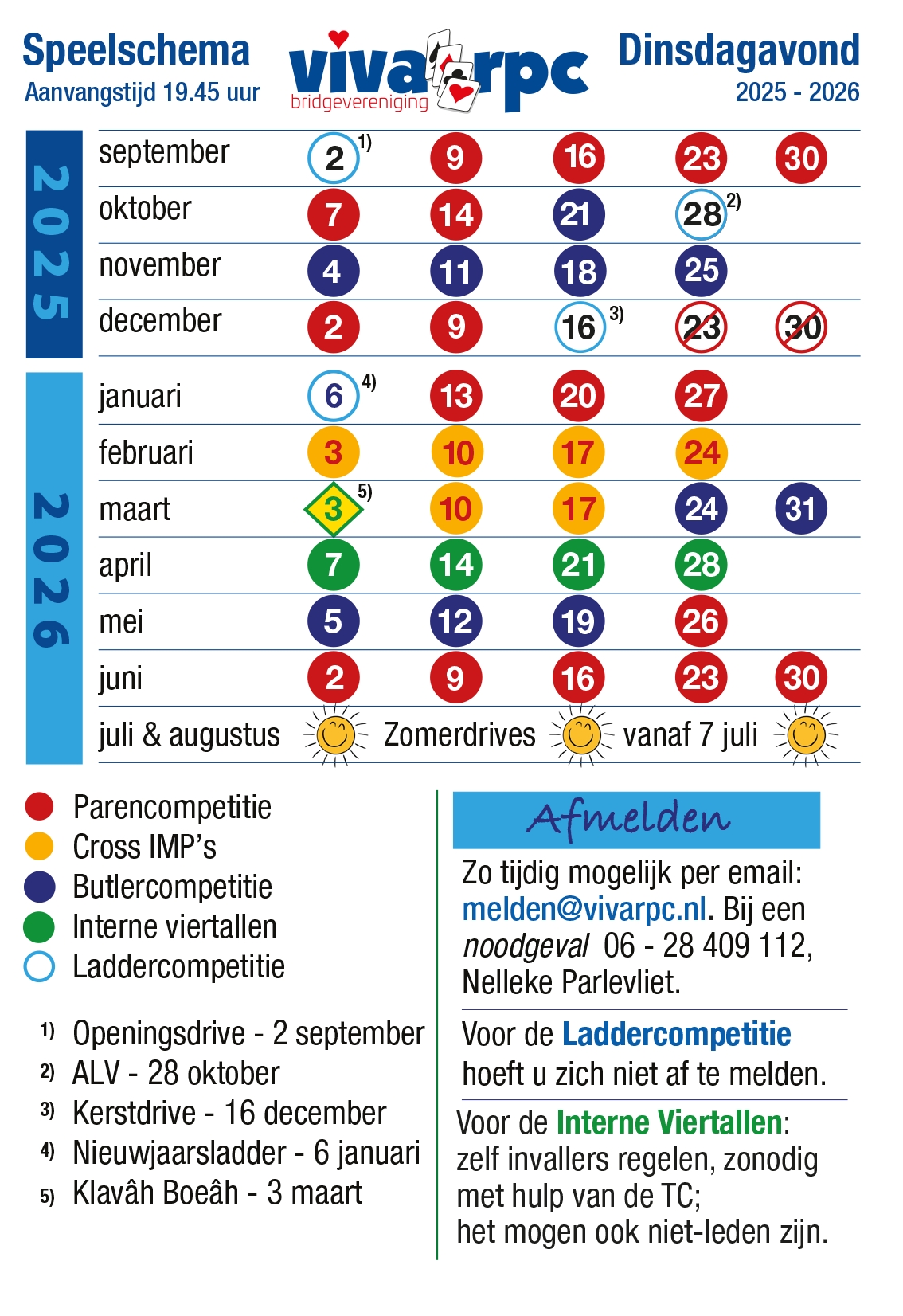 Het jaar door hebben we een gevarieerd programma met meerdere soorten competities, waarbij rekening wordt gehouden met schoolvakanties (voorjaar/paas/herfst/kerst). Op deze avonden is er een vrije speelavond. Met de Openingsdrive, Kerstdrive (diner) , Nieuwjaarsdrive (oliebollen en bubbels) en Paasdrive (gevulde eieren) zorgen we voor extra aankleding van de avond. Klik hier voor onze jaarkalender.
